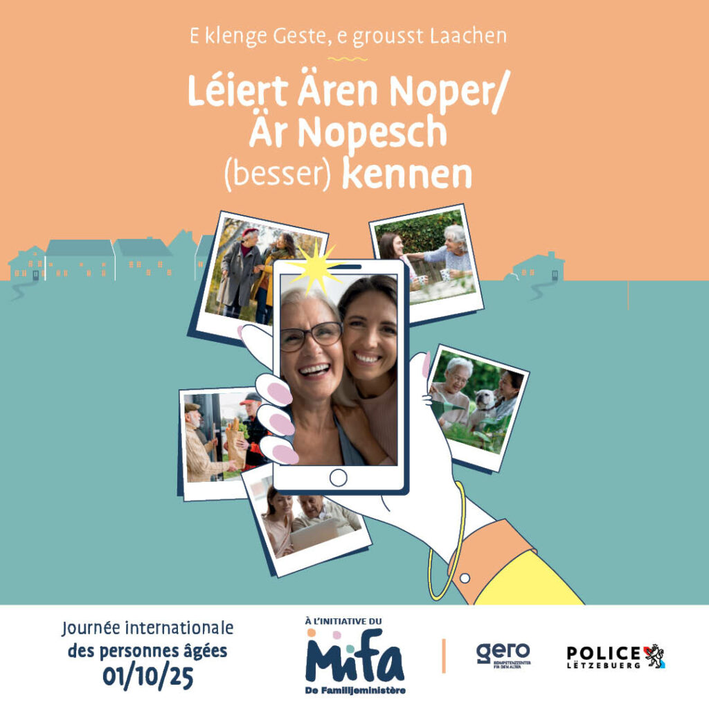 Zum Internationalen Tag der älteren Menschen starten das Ministerium für Familie, Solidarität, Zusammenleben und Unterbringung von Flüchtlingen, die Polizei und GERO eine Kampagne, um Nachbarschaften zu stärken – besonders die Verbindung zu älteren Mitmenschen.